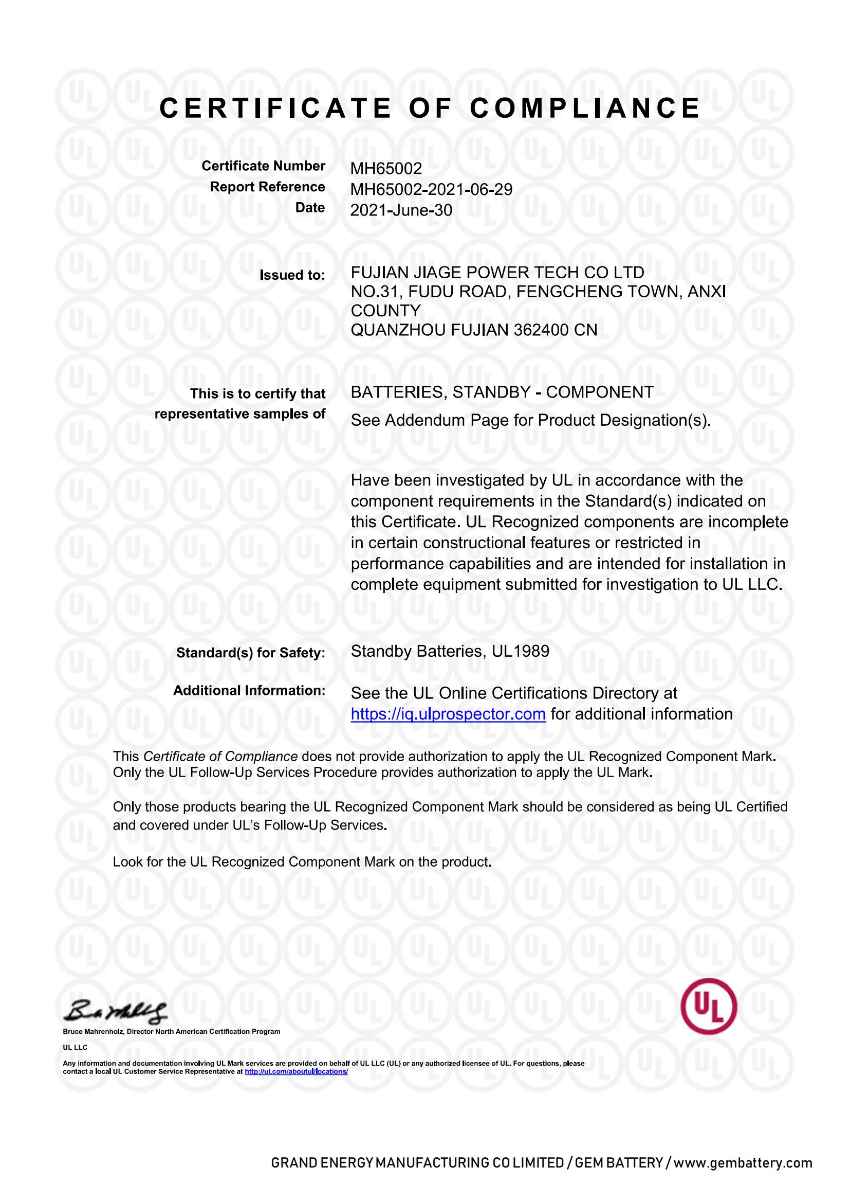 Tenemos certificados que incluyen ISO 9001, ISO 14001, ISO 45001, IEC60896-21/22, CE, RoHS, UL y TLC.
